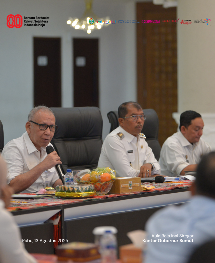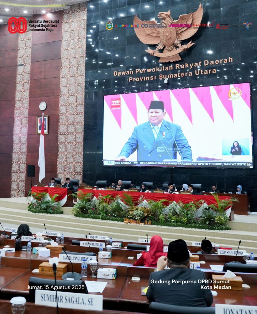 “Dengarkan Pidato Presiden RI dalam Rangka HUT ke-80 RI” Gubernur Sumatera Utara (Sumut) Bobby Nasution bersama Wakil Gubernur (Wagub) Surya, mendengarkan pidato kenegaraan Presiden RI Prabowo Subianto, dalam rangka Hari Ulang Tahun (HUT) ke-80 Kemerdekaan Republik Indonesia. Acara yang berlangsung secara virtual itu dilaksanakan di Gedung Paripurna DPRD Sumut, Jalan Imam Bonjol Medan, Jumat (15/8/2025).