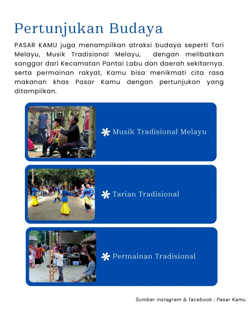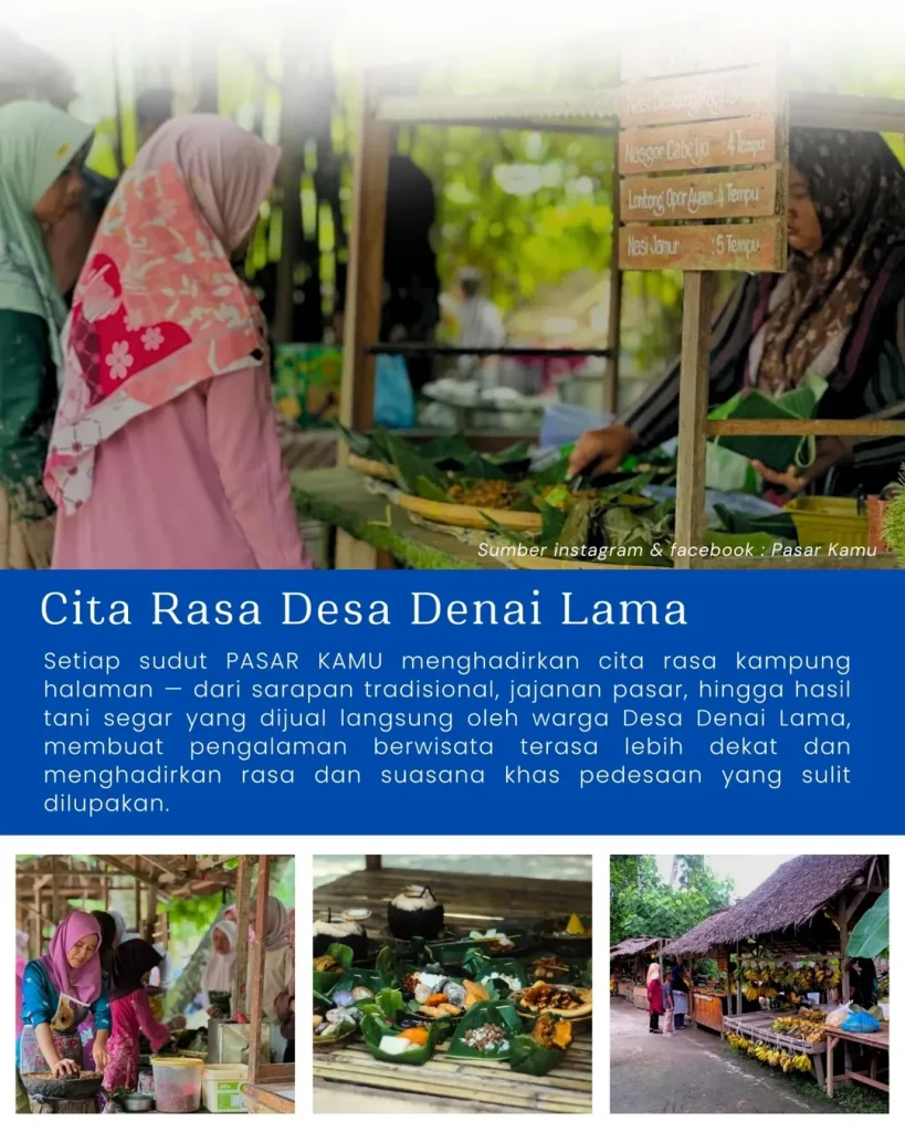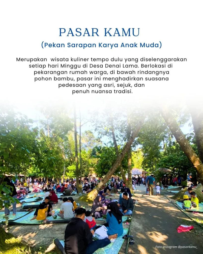 Berlokasi di Desa Wisata Kampoeng Lama, Kecamatan Pantai Labu, Kabupaten Deli Serdang, Pasar Kamu menawarkan pengalaman wisata kuliner yang unik dan hanya dapat dinikmati setiap Minggu pagi. Mengusung konsep ramah lingkungan, seluruh transaksi dilakukan menggunakan koin kayu bernama Tempu, yang menjadi ciri khas pasar ini. Pengunjung dapat mencicipi beragam menu tradisional khas Sumatera Utara yang autentik, sambil menikmati perpaduan harmonis antara keindahan alam pedesaan dan kekayaan cita rasa Nusantara dalam satu destinasi istimewa.