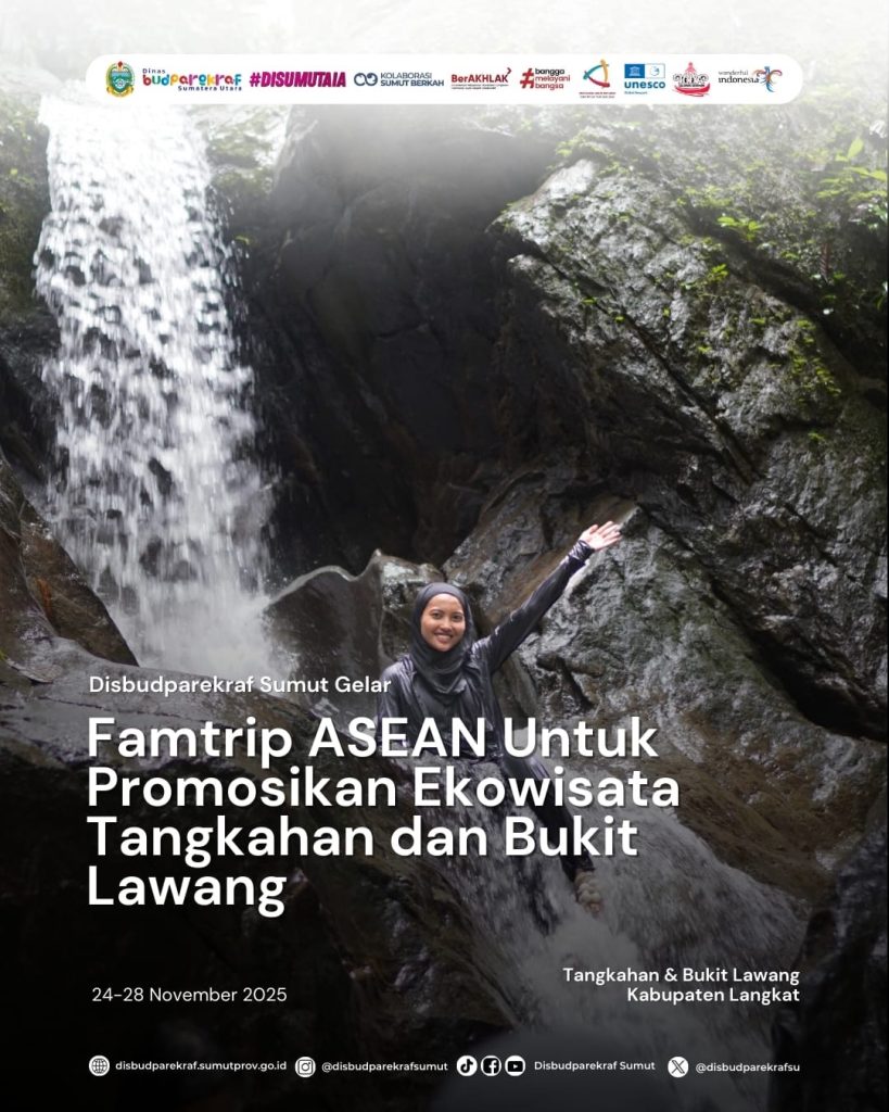 Disbudparekraf Sumut menggelar Famtrip ASEAN (24–28 Nov 2025) untuk mempromosikan destinasi ekowisata Tangkahan & Bukit Lawang di Taman Nasional Gunung Leuser.