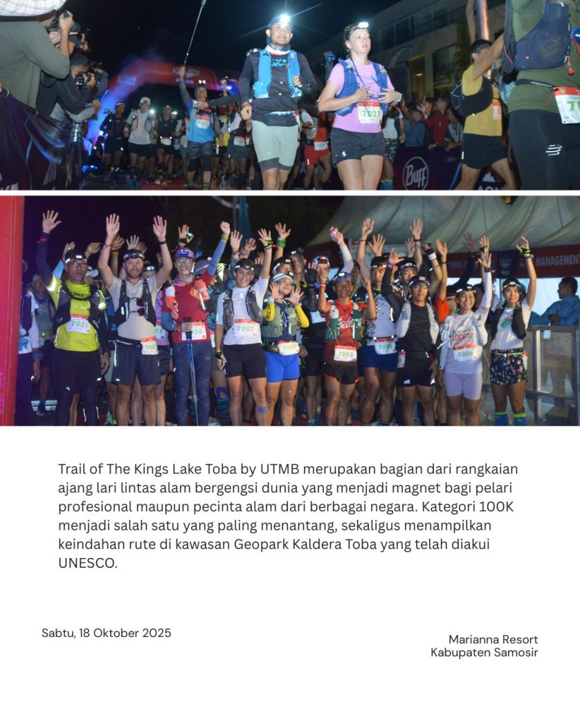 61 Pelari 100 K Tepat pukul 03.00 WIB dini hari, Gubernur Sumatera Utara, Bobby Nasution secara resmi melepas 61 peserta kategori 100 kilometer pada ajang Trail of The Kings Lake Toba by Ultra Trail du Mont Blanc (UTMB) 2025. Para peserta yang berasal dari berbagai negara ini akan menempuh lintasan ekstrem yang menyuguhkan panorama menakjubkan Danau Toba khususnya keindahan alam di Pulau Samosir.